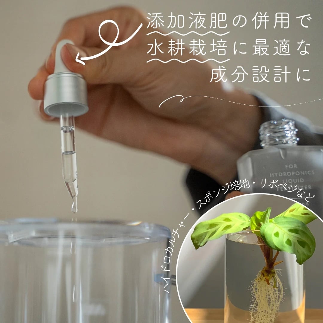 「水でうすめる添加液肥 お試しサイズ20ml」が付属!併用することで、水耕栽培やハイドロカルチャーに最適な栽培溶液に